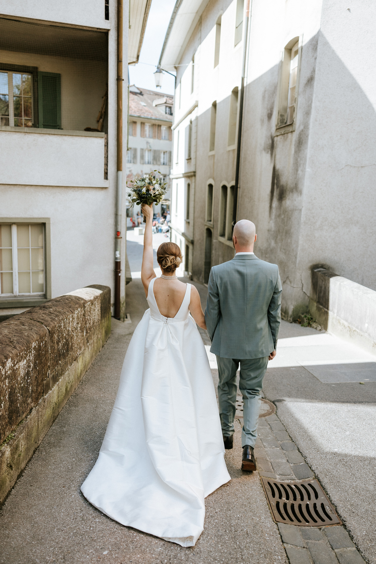 Draussen wurden die Zwei dann lautstark von Freunden und Arbeitskollegen empfangen. Mitsamt musikalischer Begleitung verschoben wir uns für das Apéro in die Altstadt von Burgdorf. Beim Apéro im Stadthaus wurde nahtlos an die tolle Stimmung angeknüpft, woran auch die tolle Liveband Uptown Lights nicht ganz unschuldig war. Ihre Lieder füllte das Atrium und es dauerte nicht lange, bis die Tanzfläche von fröhlichen Gästen erobert wurde.